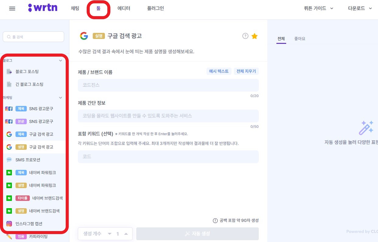 툴 기능을 사용하면 SNS, 리포트, 블로그 등 다양한 포맷에 맞는 응답을 제시해 줍니다.